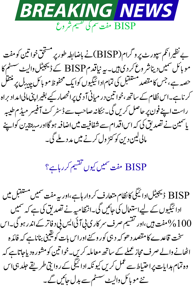 The administration has also warned that some people may spread false information or ask for money to help women get the SIM. Beneficiaries should trust only official BISP staff and government messages.