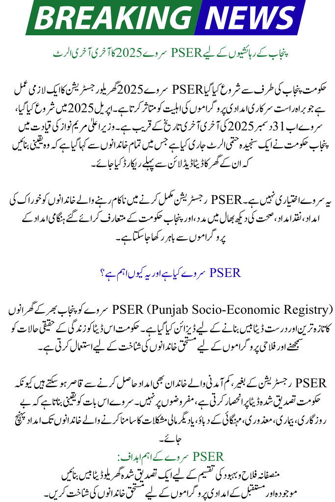 PSER Survey 2025 Final Deadline Alert for Punjab Residents
